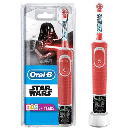 Oral-B欧乐B 儿童电动牙刷 星球大战款,欧乐B电动牙刷适用于3岁以上儿童。配备一个动力头,旋转头上有非常柔软的鬃毛,可以够到、包裹和仔细清洁小家伙的牙齿,同时他们还可以享受迪斯尼乐园的乐趣,充电一次可使用8天。