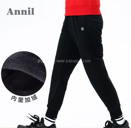 安奈儿 男童秋冬加绒加厚休闲运动裤,混纺针织面料,柔软舒适,穿着不紧绷;加厚夹绒内里,触感细腻,松软微弹,提供温暖同时活动依然方便自如;高弹力罗纹裤腰,宽边设计不勒肚子;斜插式口袋,可放随身小物,休闲实用。罗纹收口束脚造型,活动轻松自如。