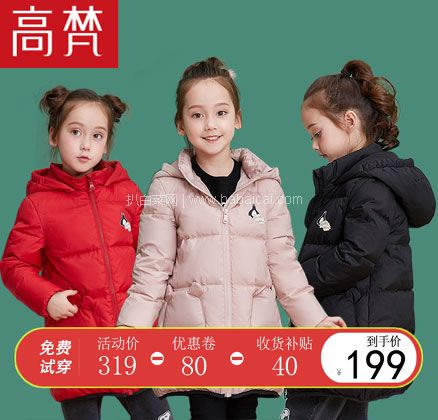 天猫商城高梵盈安专卖店售价¥319,可使用¥150优惠券,实付¥169包邮,3色可选,110~160码全。反季清仓,高梵品牌保证,防寒拉架布包边,锁住温暖,多种颜色,精彩不重样,温暖连帽,呵护宝宝不怕冷。 天猫商城购买地址>>