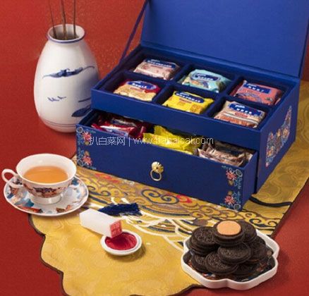 这款奥利奥x故宫食品 朕的心意 联名款 中秋节夹心饼干礼盒的奥利奥都是全新口味,礼盒内含有古早山楂风味、真香绿茶糕风味、辛辣胡椒饼风味、荔香玫瑰糕风味、秘制红豆酥风味、潮式叉烧酥风味 各4枚,还送“朕的心意”茶宴套装:茶杯、茶碟、点心碟、奥利奥玉玺、朱砂印泥、茶垫纸巾。