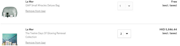 另外网站购La Mer产品满350英镑(约3542.52港币)还送品牌礼包一份,满额自动加车,如下图2所示;