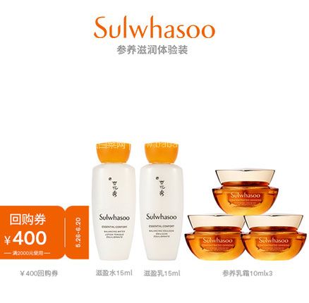 • 白菜!超划算!SULWHASOO 雪花秀 滋盈水+乳15ml*2+御时紧颜参养乳霜10ml*3个 券后新低¥69.9元包邮