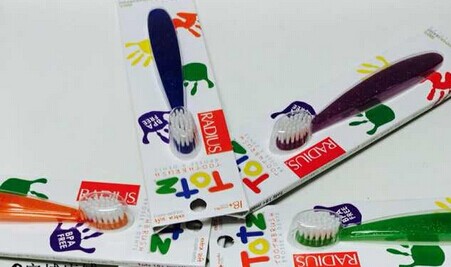 Radius独家高品质超柔软刷毛,有宝宝专用,也有成人专用的。椭圆形刷头,无角度设计,不会伤害宝宝柔嫩的嘴巴。锥形手柄适合宝宝小手抓握。刷毛由100%的蓖麻子、蔬菜提取物制 成。手柄不含BPA(双酚A),纯聚丙烯手柄-专为喜欢咀嚼的婴幼儿设计。有多种颜色,颜料安全无毒,经美国FDA认证,可以放心挑选!。无任何染料--世界上第一个完全无染料牙刷;8000根超软优质刷毛,每根刷毛的头均打磨圆滑。圆锥手柄,适合宝宝玩耍,家长更容易控制。刷毛排列布局避免对牙齿的磨损。扁圆头—无角设计。