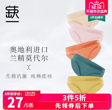 天猫商城:双12预告!蒛一 莫代尔轻薄无痕抗菌内裤 5条装 新低¥33.11元包邮 12日0点开始~