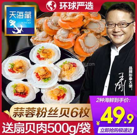 天猫商城:天海藏 蒜蓉粉丝贝 6枚共200g 送扇贝肉500g 现¥49.9,叠加¥30优惠券,券后¥19.9包邮 肉肥黄厚,蒜香浓郁~
