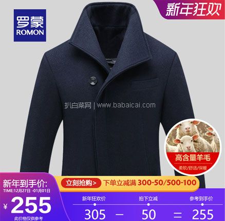 天猫商城罗蒙恒乐专卖店售价¥305,下单立减50元,还可叠加¥60优惠券,双重优惠实付¥195包邮,多款可选。中长款修身休闲羊毛呢子大衣,50%羊毛含量,精选优质毛呢面料,密边工艺,不易起球,具有很好的耐磨性能。天猫商城购买地址>>