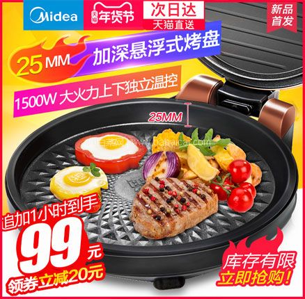 天猫商城:Midea 美的 JHN30F 家用双面加热电饼铛 现¥109,叠加¥30优惠券,券后¥79包邮 180度开合,双盘独立加热~
