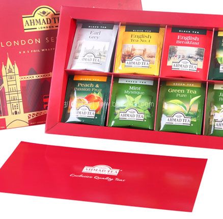 这款AHMAD 英国亚曼伦敦精选茶叶,深红明亮,陈香浓郁,滋味醇厚,口感顺滑,高香耐泡,让人沉醉,精品礼盒装!内含:英式早餐红茶、茉莉绿茶、柠檬香柠红茶、绿茶、英式一号红茶、薄荷绿茶、格雷伯爵红茶、水蜜桃百香果红茶。规格:2g/袋*5袋*8种 。