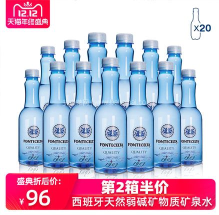 天猫商城:西班牙原装进口,Fontecelta 霏澈 天然矿泉水330ml*20瓶 现¥59,领¥10元优惠券,券后史低¥49包邮,折合约2.5元/瓶    含气款同价~