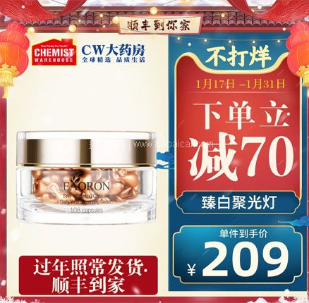 这款胶囊精华,目前天猫国际ChemistWarehouse海外旗舰店售价¥279,下单立减70元,还可领40元优惠券,双重优惠实付169元包邮,同款考拉¥279。顺丰包邮,春节照常发货!面部提亮,保湿滋润,夏日最需要的美白护肤。天猫国际购买地址>>