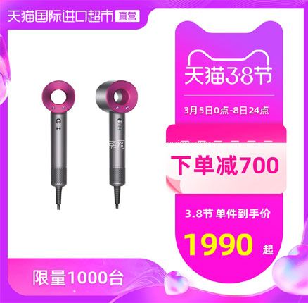 高颜值无扇叶吹风机久违低价!有需求的朋友可以趁38活动入手,大牌好价不常有。天猫国际超市售价¥2690元,下单立减700元,还可叠加¥100优惠券券单领,双重优惠实付¥1890包邮(需另购转换插头),88VIP下单还可减94.5元,低至¥1795.5元。以往普通售价2000元以上。戴森数码马达,风量大,并且拥有进准控温设计,保护秀发不受损伤。 天猫国际购买地址>>