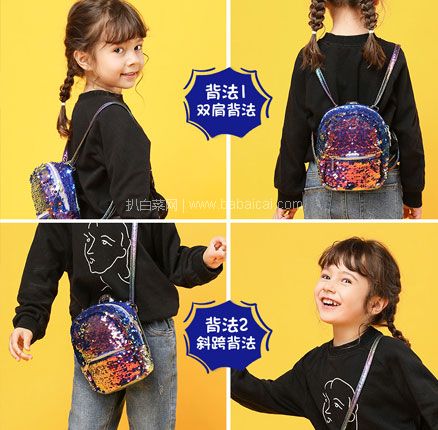 这款背包天猫商城绘儿乐官方旗舰售价¥208,第一款炫彩精灵包此价,可叠加¥120优惠券,券后实付¥88包邮,另有人鱼公主、百变星星、粉红兔小姐三款可选,尺寸略大一点,券后¥131包邮。仿人鱼鳞片,blingbling的,家里小公主绝对超爱的,官方旗舰店点出品,品质也有保障。天猫商城购买地址>>