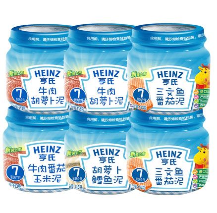 天猫商城:Heinz 亨氏 胡萝卜鳕鱼泥 113g*6瓶 4种口味 现¥64.75元,领¥10元优惠券,券后¥54.75元包邮 折¥9.12元/瓶