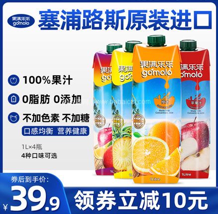 天猫商城:塞浦路斯进口 Gomolo 果满乐乐 100%纯果汁 1L*4瓶 多口味 券后¥29.9元包邮    天然果肉压榨,富含丰富的维生素C,比国产还便宜~