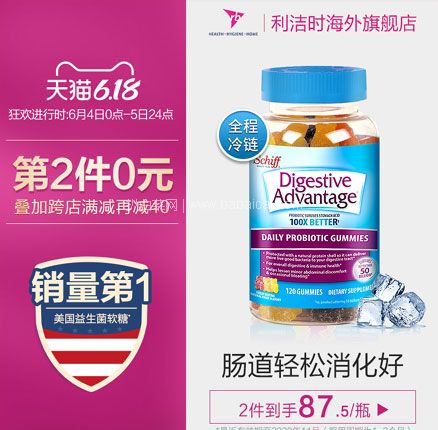 天猫国际 利洁时海外旗舰店目前120粒装售价¥219,第二件0元,叠加¥80优惠券,叠加每满¥300-40跨店满减,下单2件,实¥99包邮包税,折合¥49.5/瓶的入手低价,下单还赠送Airborne美国维生素c增强免疫儿童成人咀嚼片32粒。酸甜Q弹,水果口味,给肠道添活力,适合成人及3岁以上儿童,2020年8月到期,介意者慎拍。天猫国际购买地址>>