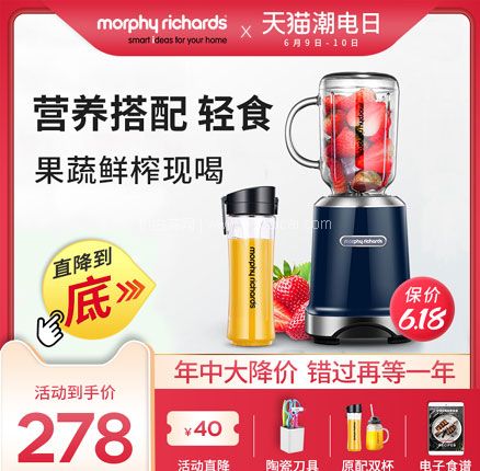 天猫商城:morphy richards 摩飞 MR9500 多功能榨汁机(赠陶瓷刀套装)现¥278,叠加¥50优惠券,券后¥228元包邮