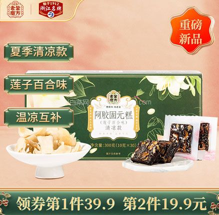 天猫商城:老金磨方 阿胶固元膏糕 莲子百合味 300g 现¥59.9,领¥40优惠券,券后¥19.9元包邮 双胶润养,温和不上火~