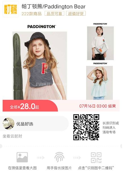 优品好选:微信端扫描二维码进活动专场下单!Paddington Bear 帕丁顿熊 童装 疯狂促销 还可叠加优惠券 特别便宜,今天带小熊图案的上架不少,早下手!