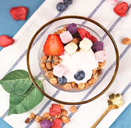 这款 中粮山萃 酸奶果粒混合麦片 350g,内含黄桃、蓝莓、草莓酸奶块,添加谷物燕麦圈,科学配比,营养美味,开袋即食。