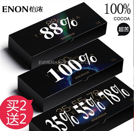 怡浓 纯黑巧克力,使用健康的纯可可脂,35%、55%、64%、78%、88%、100%浓度多款可选,满足不同口味。