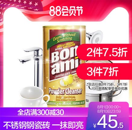 天猫商城:美国进口 BON AMI 宝纳米 去污粉清洁神器400g 现¥45.5,领¥20优惠券,券后新低¥25.5元包邮 厨房油污、小白鞋、大理石瓷砖清洁神器!