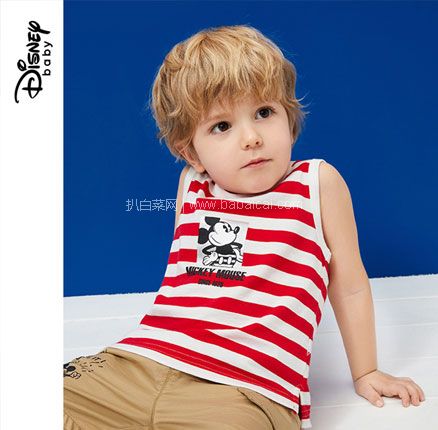 Disney baby 迪士尼 男童卡通纯棉背心 ,货号: DB021CE01,纯棉材质,柔软舒适,亲肤透气。红白宽条,简约大方,卡通迪士尼米奇图案,时尚可爱,活泼童趣。