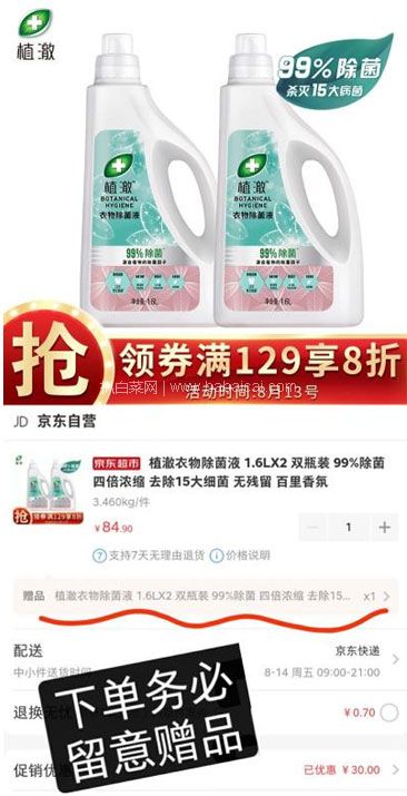 除菌液 神价车!自营 植澈 衣物除菌液 1.6L*2瓶,再送同款1.6L*2瓶,券叠加立减30元,实付¥34.9+几元元运费,太白菜了,折约2.7元/斤!平时好价也要六七块一斤。京东商城购买地址>>