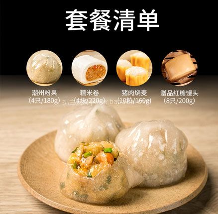 天猫商城:雅泰隆 早餐组合(速食潮州粉果4只180g+糯米卷4块180g+猪肉烧麦10粒130g) 送8只红糖馒头200g 券后¥28元包邮 皮薄劲道,软糯可口,简约速食~
