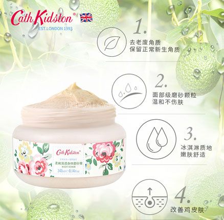 Cath Kidston 英国天然柔嫩光滑身体去角质磨砂膏240ml,植物精粹,细腻亲肤,面部护理级磨砂颗粒,质地柔和;冰淇淋质地,一抹即开,温和去角质,舒适嫩肤,容易冲洗;添加山羊奶成分,保湿滋润不紧绷;元气少女清新水果味,让人心情愉悦。