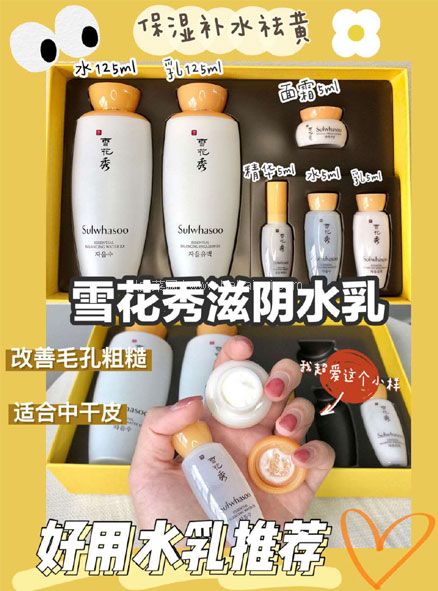 这款雪花秀滋阴水乳套装,包含:125ml 护肤水+125ml 乳液+同款水15ml+乳ml+精华液8ml+面霜5ml。通过滋阴丹从根本治理因阴气不足而导致的老化现象,由内而外帮助改善肌肤老化,平衡水含马齿苋萃取物供给肌肤水分,缔造饱满水润肌肤,平衡乳含牡丹提取物让肌肤柔滑。