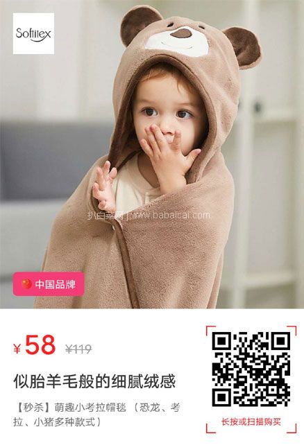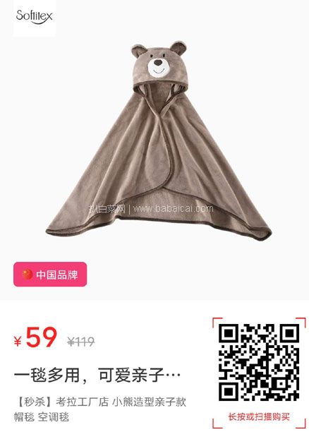 考拉海购内部折扣店:墙裂推荐!小熊/小考拉带帽盖毯 ¥58或¥59包邮 超值,防寒保暖,也可当浴巾!
