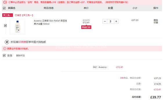 Feelunique中文网现有Aveeno艾维诺线上9折+买三免一促销,无需用码,加入购物车自动减;