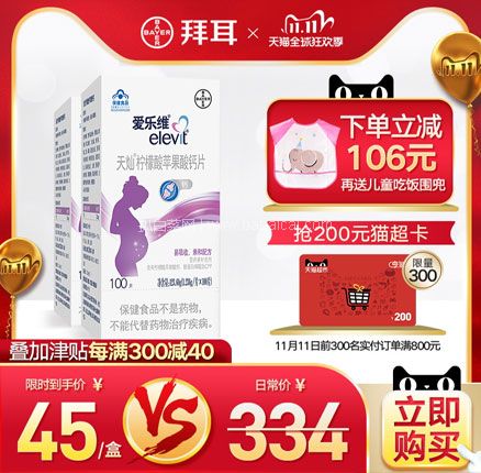 之前长期¥115/瓶,现低至¥53.8/瓶新低价!天猫商城拜耳健康消费品旗舰店聚划算售价¥197,买一赠一同款,参与1件8折活动,还可叠加¥50优惠券,券后实付¥107.6包邮,到手2瓶,折合¥53.8/瓶的新低价。 Elevit爱乐维是德国拜耳出品,品质有口皆碑,缓解体力疲劳,提高精子活力。聚划算购买地址>>