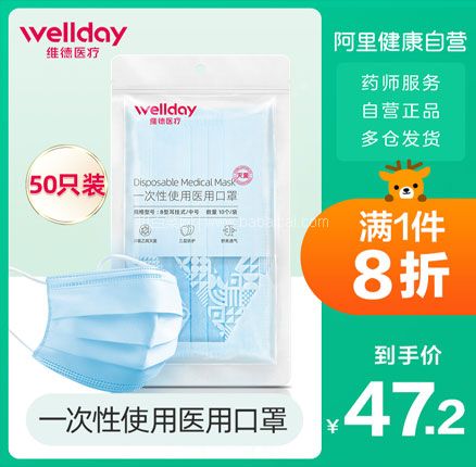 天猫商城:维德医疗 灭菌级一次性医用口罩 50只 双重优惠后¥19.55包邮 过年不打烊!药监认证,医用品质~