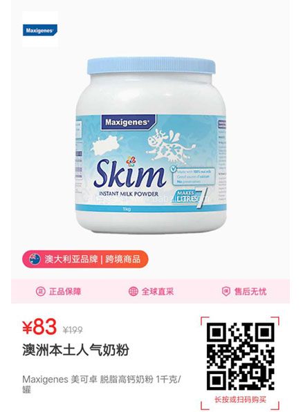 澳洲药房超人气成人奶粉!在澳洲它的火爆人气不亚于德运,胖嘟嘟的外表,炒鸡有料的内涵,承载着全家人的健康营养,每100g仅含脂肪1g,脱脂版更适合减肥期间人群。目前1kg*2罐装全脂考拉海购内部折扣店特价¥156元,含税到手¥170.2,折合85元/件好价,考拉自营发货,自用送人都不错。澳洲药房超人气成人奶粉!在澳洲它承载着全家人的健康营养,每100g仅含脂肪1g,脱脂版更适合减肥期间人群。考拉海购内部折扣店购买地址>>