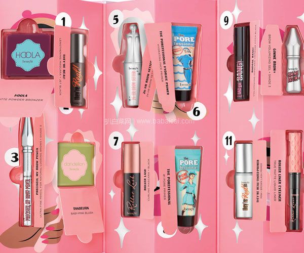 Benefit今年的圣诞日历依然是少女心满满!12件全明星mini套装,反恐精英普通版和珍珠款,蒲公英腮红、眉笔、眼线笔和hoola阴影都有!