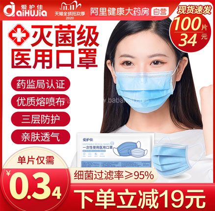 天猫商城:白菜!爱护佳 灭菌级一次性医用外科口罩 50只 双重优惠后¥9.9元包邮 灭菌级医用外科口罩,好价可囤!