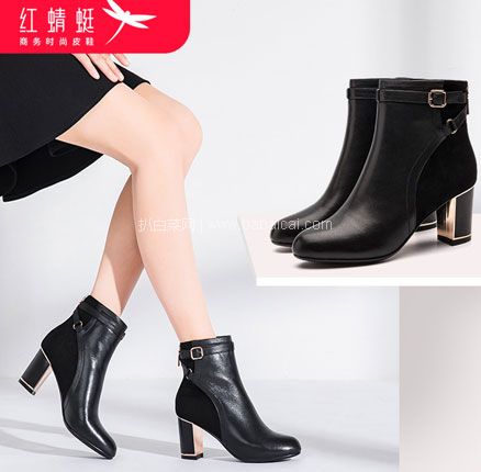 红蜻蜓 女款加绒保暖韩版百搭粗跟真皮短靴,鞋面弹力绒加真皮材质,时尚拼接鞋面,创意设计不撞鞋;加绒内里,贴合双脚肌肤,柔软舒适;金属饰扣搭配细腻皮质,简约不失优雅;粗跟设计上脚显瘦更显腿长,橡胶防滑鞋底,久站不累。
