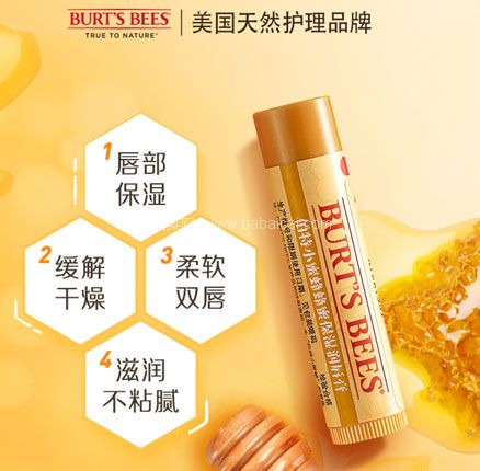Burt's Bees 小蜜蜂 经典护唇膏,100%纯天然,也是一直以来最畅销的小蜜蜂明星商品。一般护唇膏大多只使用2—3种护理油,可是Burt's Bees护唇膏却采用多重滋润配方:蜂蜡、椰子油、维生素E、薄荷油、绵羊油、迷迭香、紫草根萃取精华……光看到这些油润润的配方名,你就可以想象它有多滋润。不管在雪地或是干冷气候里,它都能让干裂嘴唇获得极度滋养及舒缓,让你拥有水嫩双唇。对于嘴唇开裂、爆皮或者灼痛感现象有极大的修复和缓释疼痛作用。