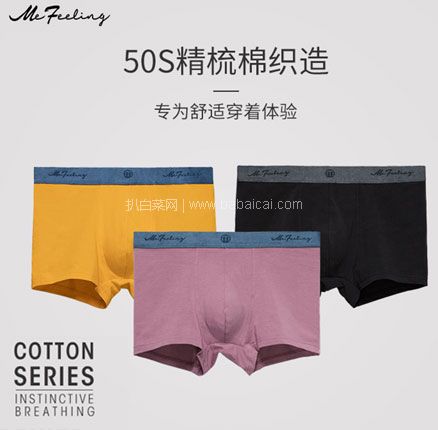 天猫商城:me feeling 男士50S纯棉四角内裤3条 多色 现¥59.9,领¥20优惠券,券后¥39.9元包邮 性价比出色!一条会呼吸的内裤~
