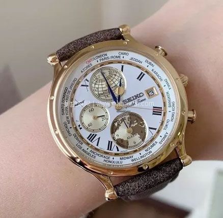 Seiko Men's Essentials Gold Tone Japanese Quartz With Leather Calfskin Strap精工 三眼计时男表,货号SPL060,属于Essentials限量版世界时间系列,旨在庆祝发现时代30周年,采用日本石英机芯,走时准确,拉丝不锈钢表壳,镀金表圈,三眼白色表盘搭配黑色简三针,复古罗马数字时标,带有世界时刻度,表径40mm,厚度10mm,3点钟日期显示,强化Hardlex表镜,棕色真皮表带,防水50米。