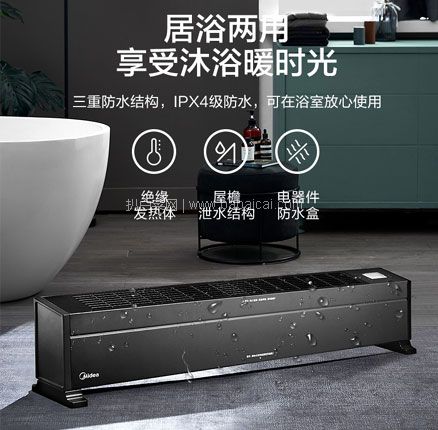 这款Midea 美的 HDX22KGN 家用踢脚线取暖器,适合18-25㎡房间,860mm加长铝合金翅片发热体,5秒自动形成热能空气墙,室内整体均匀升温,阻隔冷空气,大面积加热空气,自然对流,均匀温暖室内,1100W/2200W两档可调,三重防水结构,IPX4级防水,倾倒断电,过热断电保护,还可做烘衣机使用,无光无噪,整夜好眠。