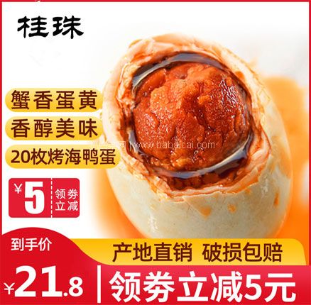 天猫商城:桂珠 咸鸭蛋烤海鸭蛋 65g*20枚 双重优惠新低¥21.8元包邮    蛋白细嫩,口感爽滑,咸香可口~
