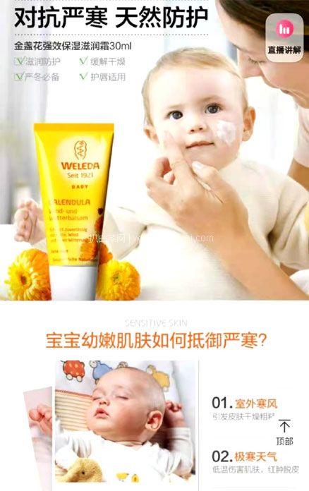 Weleda维蕾德婴幼儿儿童金盏花防风滋润面霜,含有丰富的金盏花提取物,能够保护娇嫩的面部皮肤,纯蜂蜡和羊毛脂能够为肌肤形成天然保护屏障,并且不会影响皮肤的呼吸,杏仁油成分能够滋润干燥肌肤,使肌肤感觉光滑滋润。