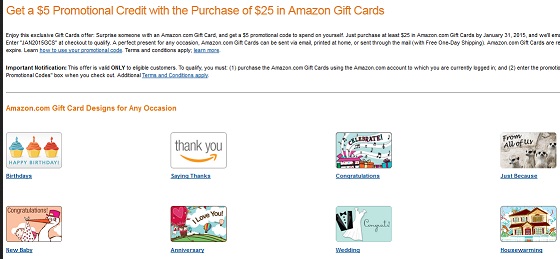 1月的礼品卡买赠活动出来了,不过不是往月的慢50送10了,变成$25送5了,有没有中奖只需要点击测试链接,如果看到的是Unfortunately就没中奖,如果能看到“Give $25 in Amazon Gift Cards, Get a $5 Promotional Credit for Yourself”的提示,就是中奖了,可以买$25的礼品卡(买邮件电子礼品卡就可以了,无需转运,直接邮件收充值码,然后充到自己账户当现金用),购买礼品卡时记得结账要使用优惠码JAN2015GCS,这样就可获得额外$5的代金券了。测试是否中奖点这里>>   |   邮件电子礼品卡购买地址>>