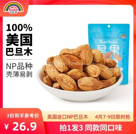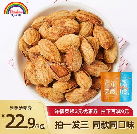 拍一发三,颗大饱满,薄壳新货。60年线下品牌,天猫商城天虹牌食品旗舰店售价¥33.9,拍一发三,下单立减¥7,可以使用¥2优惠券,下单实付¥24.9包邮,到手3包,折合¥8.3/包好价,盐焗/奶香两种口味可选。颗大饱满,薄壳新货,精选产于美国加州巴旦木,具有保护心血管、延缓衰老、增加抵抗力。天猫商城购买地址>>