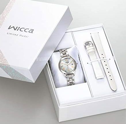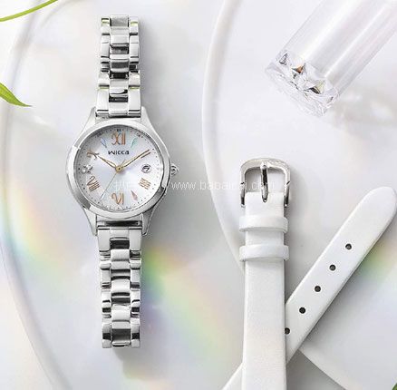 这款CITIZEN 西铁城 WICCA 光动能电波水晶手表 KS1-210-11,采用日本太阳光动能电波(H0F6),圆形不锈钢表壳,球面蓝宝石玻璃表镜,剔透似玉石,彩虹色棱镜,白色表盘,搭配彩虹般罗马时刻表和Swarovski水晶,光彩夺目。内附一组白色小牛皮替换表带带,50米生活防水功能,表盘直径:28 毫米,表盘厚度:8.3 毫米。