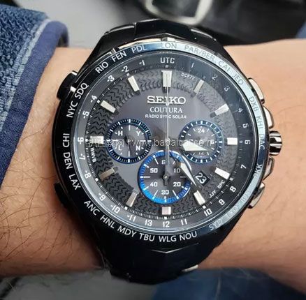 这款Seiko Coutura Men's Watch精工 男士光动能电波表,属于Coutura系列,货号为SSG021,采用日本8B92光动能机芯,太阳能供电无需电池,充满电最长可待机长达6个月,配备电波校时功能,可接收全球电波。不锈钢表壳及表链,表圈带有世界时区显示,4点位置日历窗口,3点位置24小时表盘,6点位置秒表,8-11点区间星期显示,表盘直径44.6mm,厚度11.5cm,防刮擦蓝宝石镜面,防水100米。