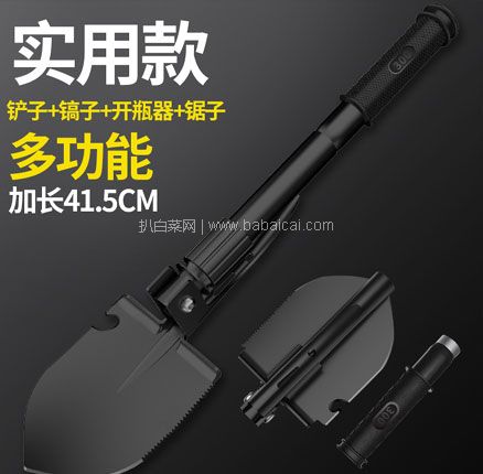 这款北山狼 户外折叠多功能工兵铲,1.9W评价,4.8分好评,展开长度为41.5cm,使用含铜高的铝合金管材搭配CR13镜面处理铲面,耐磨耐腐蚀。符合人体工程学的手柄,以及可拆卸式加长手柄,配合铲面锯齿设计,能够变换不同的状态,能够针对户外复杂的情况,提供更多功能。