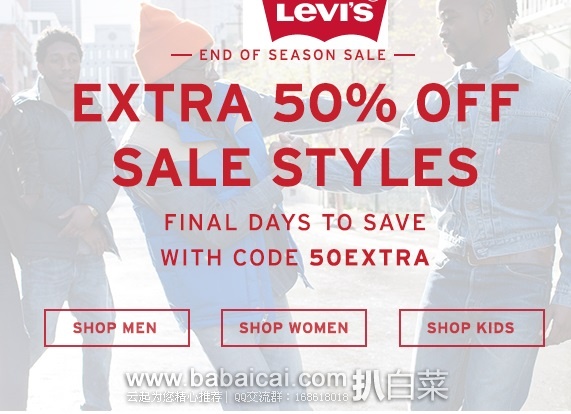 前几次都是额外6折,今天居然升级到额外5折了,这是以往黑五都不常见的力度,需结账使用优惠码50EXTRA,凑单满$100免美国境内运费。levis李维斯活动地址>>